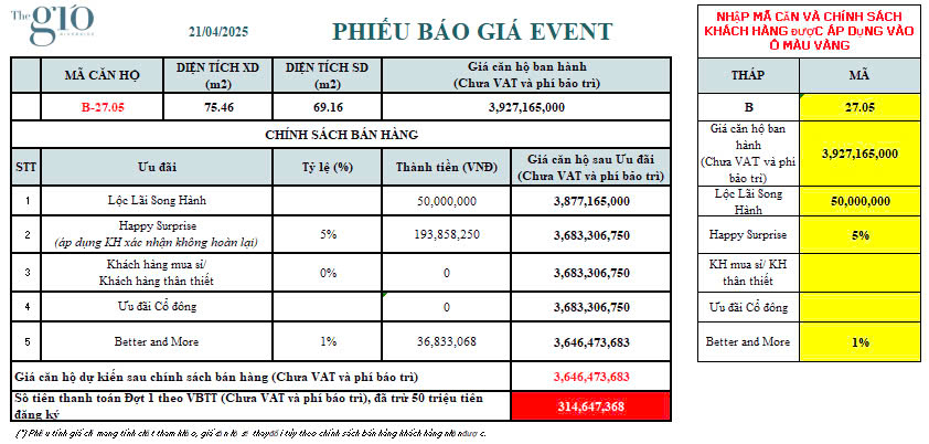 Chuyển nhượng căn 2PN+ The Gió Riverside Giá gốc: 3,927,165,000 VND khách mua giai đoạn 1 chiết khấu 6% Anh/Chị quan tâm liên hệ PKD hỗ trợ tư vấn chuyển nhượng
