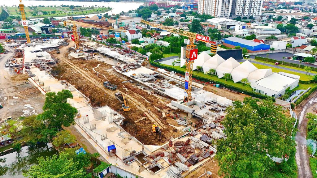 Bên cạnh chuỗi sự kiện ra mắt The Gió Riverside, ở một “diễn biến” khác, công trường dự án vẫn đang tất bật thi công các hạng mục cọc khoan nhồi và tường vây.